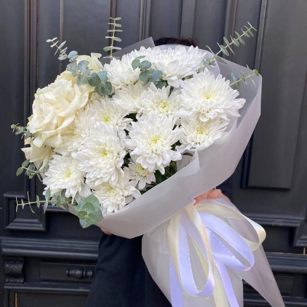 Хризантема Балтика белая, голландская роза белая, эвкалипт. Для мамы в Солигаличе